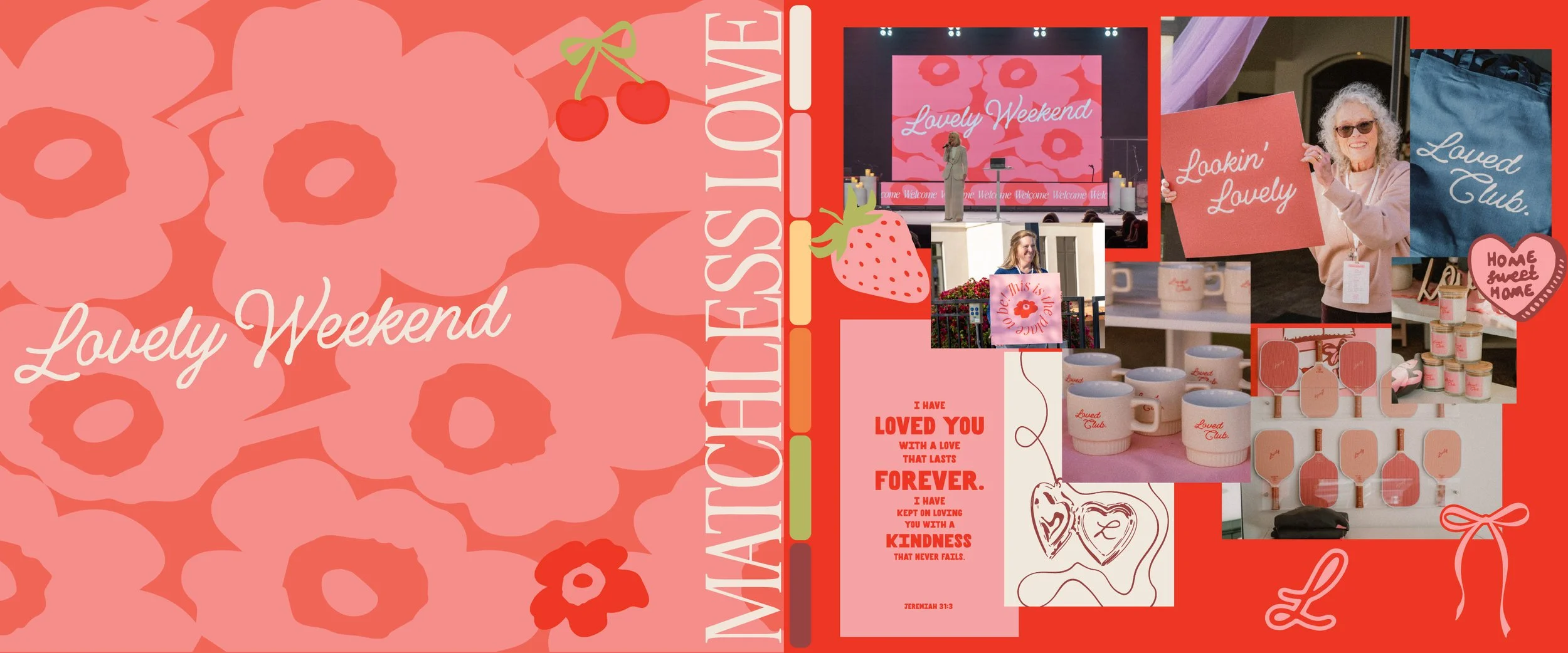 The visual identity brought that message to life in a way that felt both playful and intentional. Oversized, retro-inspired florals bloomed across bold red backdrops, creating a sense of warmth, joy, and abundance. Handwritten script layered over the top felt personal and intimate, like a note passed between friends. Punchy serif typography grounded everything with confidence and clarity. The phrase “Matchless Love” stood tall within the designs and became part of the physical environment.